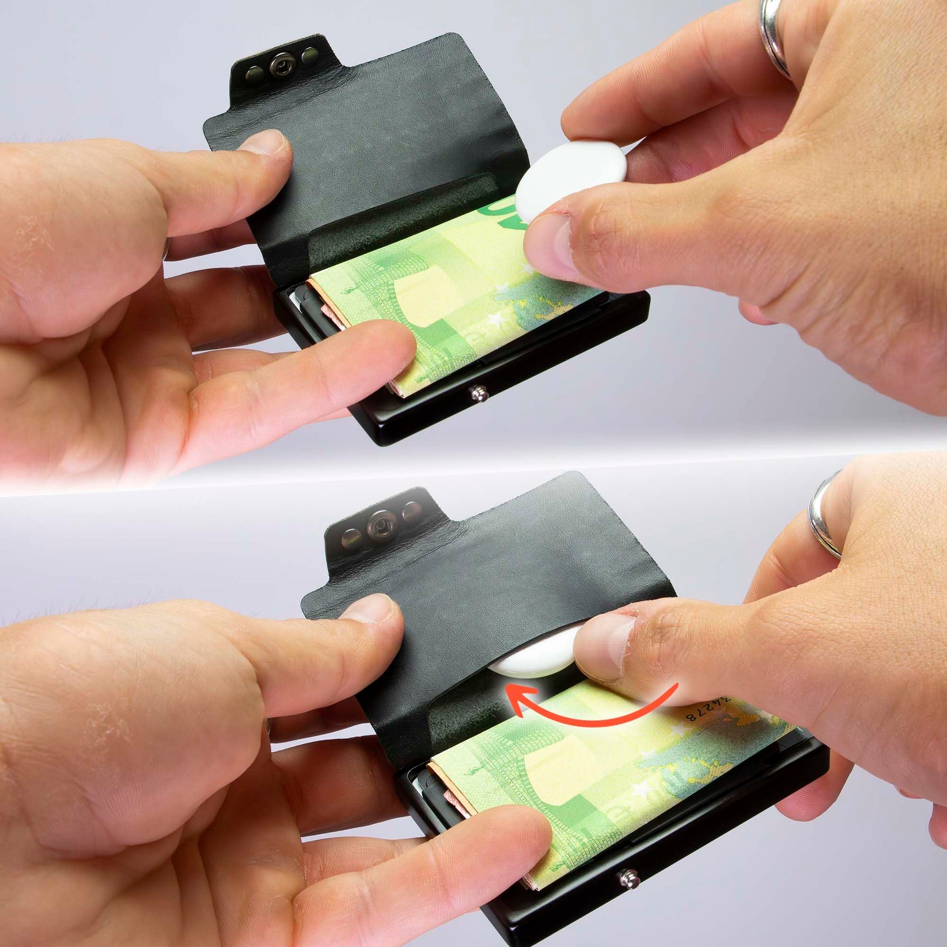 MONDRAGHI Evolution Black: Like the other mini wallets in this line, it is characterised by the coin pocket inside the flap. The shiny black light alloy shell perfectly matches the black stripes that characterise the leather surface. The look is also aggressive on this model and the finish makes the leather particularly resistant, making it especially suitable for outdoor activities. Like all compact wallets that we produce in our workshop in Bolzano, this one also meets the highest security standards and is equipped with the RFID protection and anti-cloning system. Lightness, ease of use and portability remain the fundamental principles that inspire us today in every product we make. - Black color with engraving - Up to 9 cards - Black, polished light alloy shell - RFID and NFC protection - Size: 9x6,1x1,5 cm - Weight: 38 gr